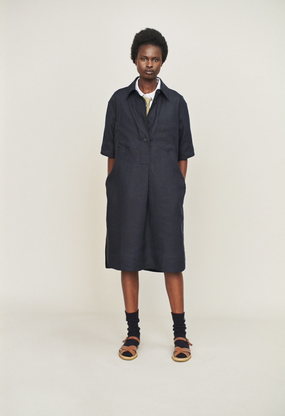2025년 봄 컬렉션의 색상 팔레트는 뉴트럴 톤과 소프트한 파스텔 색감이 주를 이룹니다. 카키, 베이지, 네이비 등 차분한 색상들이 주로 사용되었으며, 이러한 컬러는 부드럽고 고급스러운 코튼, 린넨 소재와 조화를 이루어 자연스럽고 우아한 느낌을 줍니다.