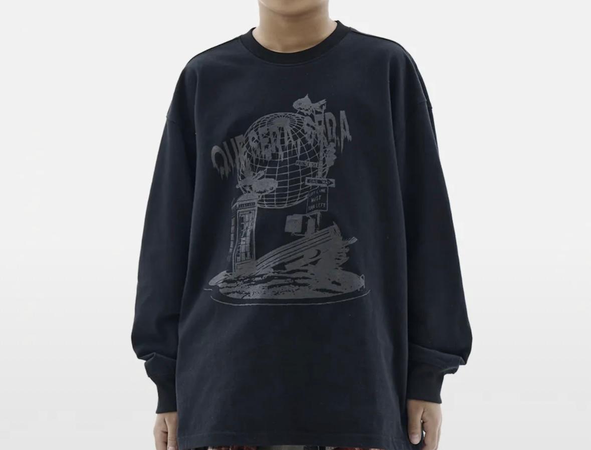 블랙 컬러를 베이스로 한 스트릿 감성의 티셔츠로, 독특한 그래픽 디테일이 매력적입니다. 체크 패턴 하의나 데님과 매치하면 힙한 스타일을 연출할 수 있습니다.